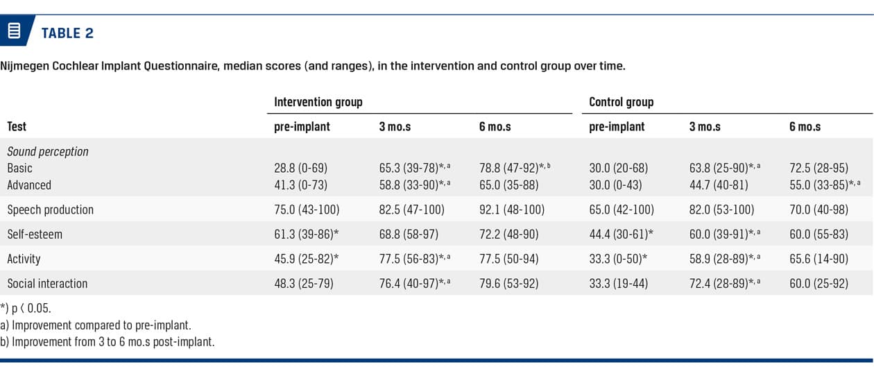 After three months, both the intervention and the control group showed significant improvement in their Dantale I scores. Furthermore, the intervention group improved significantly between three and six months in the test conditions best aided in quiet and CI alone in noise scores. The control group showed improvement from three to six months as well, but in the test condition best aided in noise. The intervention group showed improved HINT scores over time. At three months, there was a significant improvement in performance in quiet; and after six months, there was a significant improvement in performance in noise. The control group also improved over time, and the scores in the test condition best aided in noise (sentence score) were significantly better after three months.