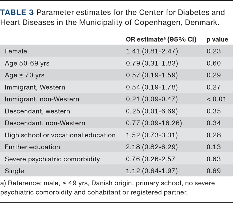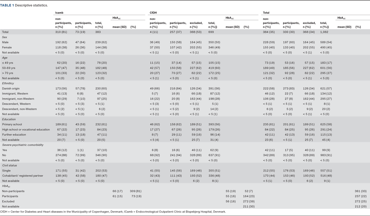 Non-Western immigrants made up 11% of the included population at the CfDH compared with 25% at the ICamb, whereas 44% of the excluded population at the CfDH were non-Western immigrants. Persons of Danish origin comprised 80% of the included population at the CfDH and 60% at the ICamb. At both sites, the majority had primary school as their highest educational attainment. The prevalence of severe psychiatric comorbidity was 7% at the CfDH and 10% at the ICamb. Overall, the mean HbA1c was higher in the ICamb population.