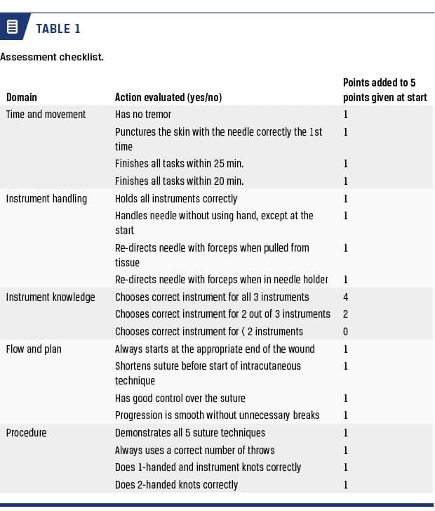 Before and after the course starts, all participants complete a test, where they perform a suture using five different techniques and tie knots on a skin-pad. The tests last twenty-five minutes and is video-recorded. The tests are then assessed by two blinded raters using the Objective Structured Assessment of Technical Skills (OSATS) [7] and give one to five points on five of the seven OSATS domains, yielding in a range from five to 25 points. To support the objectiveness of the assessment [8], a checklist based primarily on yes/no decisions has been prepared, please see Table 1. The checklist was developed based on the raters experience from supervising younger surgeons during surgery. The number of points needed to pass the post-course exam is eighteen.