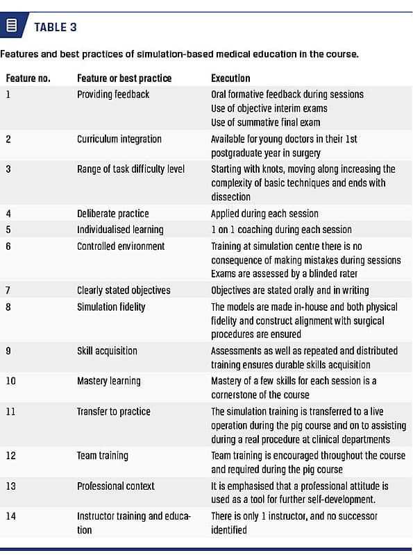 Based on literature studies, 14 features or best practices for simulation-based medical education were established [6]. We acknowledge these recommendations and the course follows all recommendations except “finding a successor”, see Table 3. Finding a successor is an important part of ensuring the continued delivery of a high-quality simulation-based medical education. Feature 11 describes the transfer of skills into clinical practice. During the course, it has not been possible to assess surgical skills in the clinical setting, which is a limitation to the course. However, the one-day operative course does assess the transfer of surgical skills from the classroom and onto live-tissue surgery. Features and best practice are supported by deliberate practice. One study found that simulation-based education with deliberate practice is more effective than traditional training [11]. The structure of the courses must be supported by the pedagogical foundations.