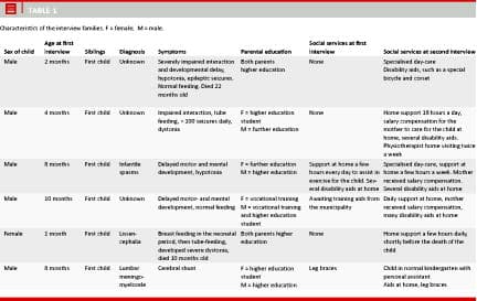All parents of 11 children suspected to be severely disabled were invited to participate. Eight sets of parents of children diagnosed with inborn severe mental and physical disabilities consented to participate. The children’s mean age was four months (1-27 months) at the time of inclusion (Table 1).