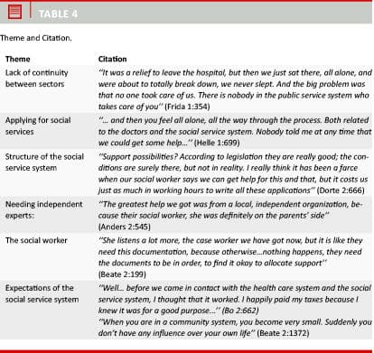 Parents did not expect the system to solve all their problems, but they expected advice, information, em-pathy and cooperation, and their experience was that this was not provided. As a result, they experienced a lack of control over their own lives, a sense of being left alone, and they felt disappointed in their expectations (Table 4).
