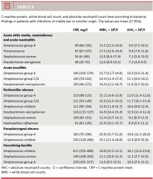 In the tonsil group, statistically significant differen-ces in the levels of CRP (p < 0.001; ANOVA), WBC (p < 0.001) and ANC (p < 0.001) were found for patients diagnosed with acute tonsillitis, peritonsillar abscess, parapharyngeal abscess and necrotizing fasciitis, respectively. With two exceptions (CRP did not distinguish acute tonsillitis from peritonsillar abscess, and ANC did not distinguish between parapharyngeal abscess and necrotizing fasciitis), CRP and ANC levels correlated with severity of infection. However, the sensitivities and specificities of CRP (sensitivity 50-80%, specificity 44-63%), WBC (sensitivity 61-80%, specificity 47-54%) and ANC (sensitivity 60-77%, specificity 44-58%) in relation to differential diagnostics were low.