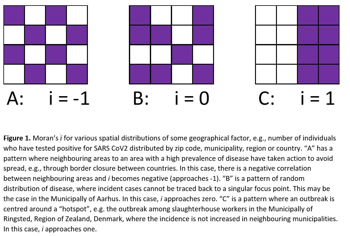 An improvement of the calculated prevalence estimate could be performed by controlling for the spatial autocorrelation of cases. Moran’s i is a measure of spatial autocorrelation that has been used in medical epidemiology to determine if hot and cold spots of disease outbreaks exist [6]. It has been used to target prophylactic actions at street levels for outbreaks of hand-foot-and-mouth disease in Shantou, China [7]. If cases are distributed at random, Moran’s i would be zero; and if cases are limited to a single hotspot, Moran’s i would approach one. Multiplying the above calculated prevalence with (1- Moran’s i) would yield control for the degree of “disease hotspotting” (Figure 1), and the equation becomes: