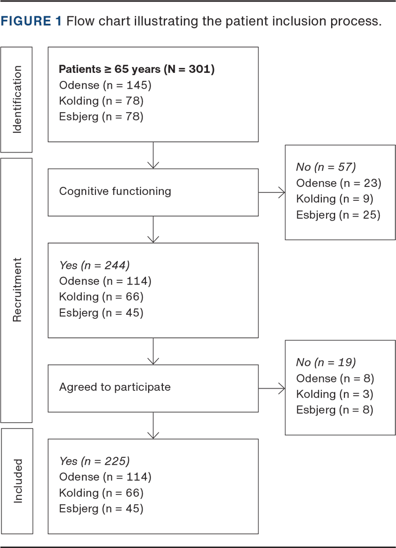 A total of 399 patients aged 65 years or older attended the three EDs during the data collection period, of whom 301 were identified. Among these, 57 were unable to provide informed consent due to cognitive impairments, and 19 patients declined to participate.