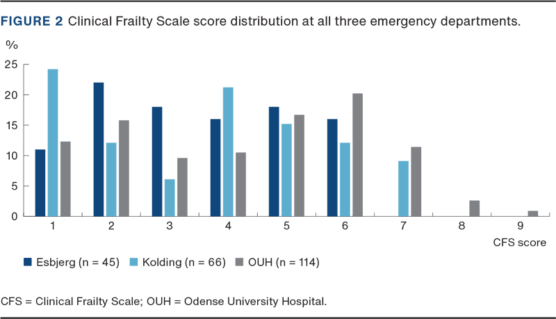 INTRODUCTION. Frailty is prevalent in older adults attending emergency departments and is associated with adverse health outcomes. Early identification of frailty is important to develop appropriate care plans and targeted interventions that address specific healthcare needs. The Clinical Frailty Scale is a validated tool used to assess an individual’s baseline health status and predict the risk of adverse outcomes in adults aged 65 years or older. This study aimed to delineate the demographic characteristics and baseline Clinical Frailty Scale scores of patients aged 65 years and older in three Danish emergency department populations.