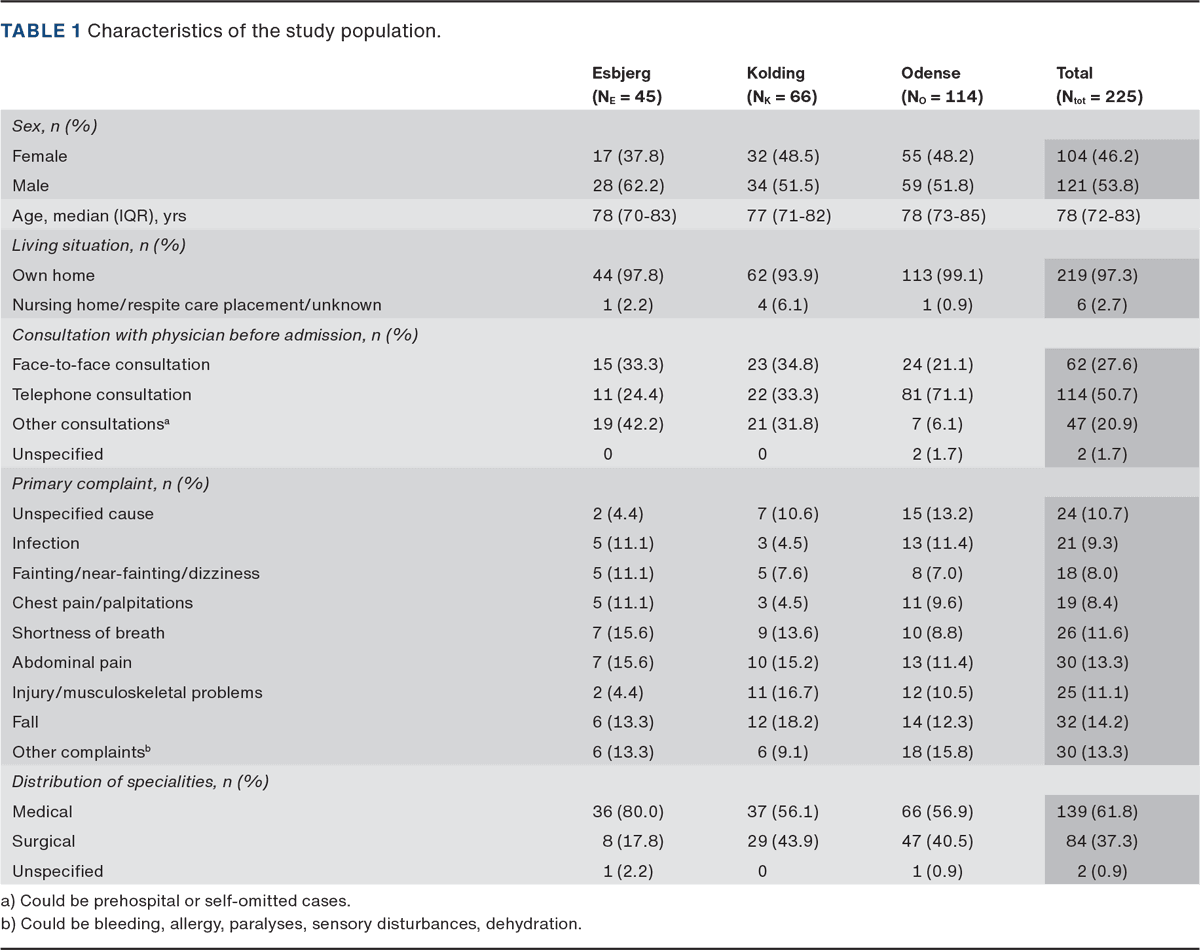 Hence, 225 patients were ultimately included (Figure 1). The median participant age was 78 years (IQR: 72-83 years), and 46.2% were female. Among the participants, 97.3% resided in their own homes, and 27.6% received home care services. Before ED admission, 27.6% of the patients had a face-to-face consultation with a physician, whereas the remaining cases involved consultations by telephone or through other means, such as contact with pre-hospital services. Telephone consultations before ED admission were more frequent in Odense (71.1%) than in Esbjerg (24.4%) or Kolding (33.3%). The most common reasons for ED presentation were falls, abdominal pain and shortness of breath. The study population was most frequently presented in the medical specialities of the ED (61.8%), and medical presentations were more prevalent in Esbjerg than at the other two sites (Table 1).