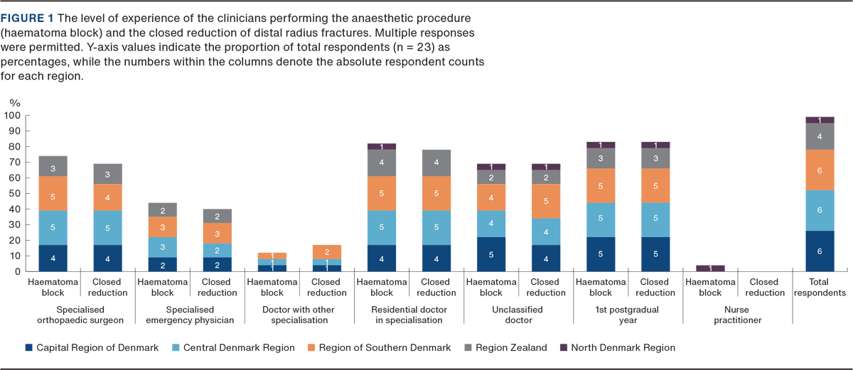 All 23 physicians responsible for an emergency department and/or a minor injury unit providing initial treatment of DRFs, including closed reduction, completed the survey, yielding a 100% response rate (23/23). Among the responders, 26% (6/23) worked in the Capital Region of Denmark, 26% (6/23) in the Central Denmark Region, 26% (6/23) in the Region of Southern Denmark, 17% (4/23) in Region Zealand, and 4% (1/23) in the North Denmark Region. Most were specialised in orthopaedic surgery (83%, 19/23). The remaining respondents were specialised in emergency medicine (9%, 2/23), public health medicine (4%, 1/23), and general practice (4%, 1/23).