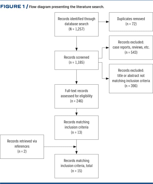 The literature search produced 1,257 publications (Figure 1). The excluded publications included 72 duplicates; 543 case reports, reviews or guidelines; and 396 publications where the title or abstract did not include data regarding analysis of the incidental 18F-FDG-PET/CT findings in cancer patients. Full-text analysis of the remaining 246 studies left 13 studies matching our inclusion criteria. Another two studies were retrieved via references (Figure 1). In the 15 studies analysed, 15,101 cancer patients (age range: 16-93 years) had 1,639 incidental foci. A total of 549 foci were not investigated due to advanced diseases or for unknown reason or were lost to follow-up; 1,090 PClR foci in 1,068 patients were investigated, revealing 270 (25%) malignancies, 166 premalignant lesions (15%) and 206 (19%) benign lesions needing treatment (PPV 59%) (Table 1), whereas 448 foci were FP (Figure 2). The 549 foci that were not investigated imply a risk of bias. If they were all TP, the PPV would be 0.73, and if FP the PPV would be 0.39. Similar calculations in our data produced a PPV of 0.83 if the foci that were not evaluated had all been TP and 0.28 if they had been FP.