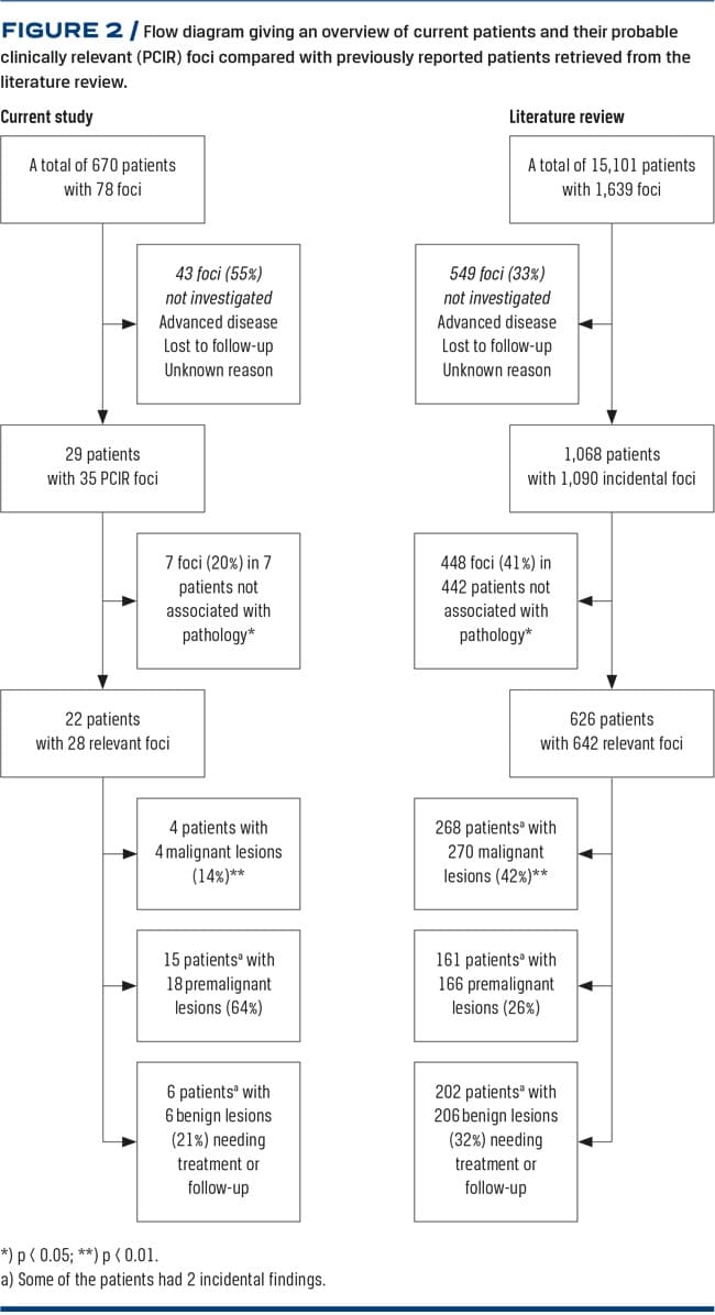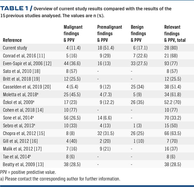 There were four malignancies (11.4%), 18 premalignant lesions (51.4%) and six benign lesions (17%). Seven foci were FP, encompassing four foci in the gastrointestinal tract and a focus in the prostate, testis and a mediastinal lymph node, respectively.