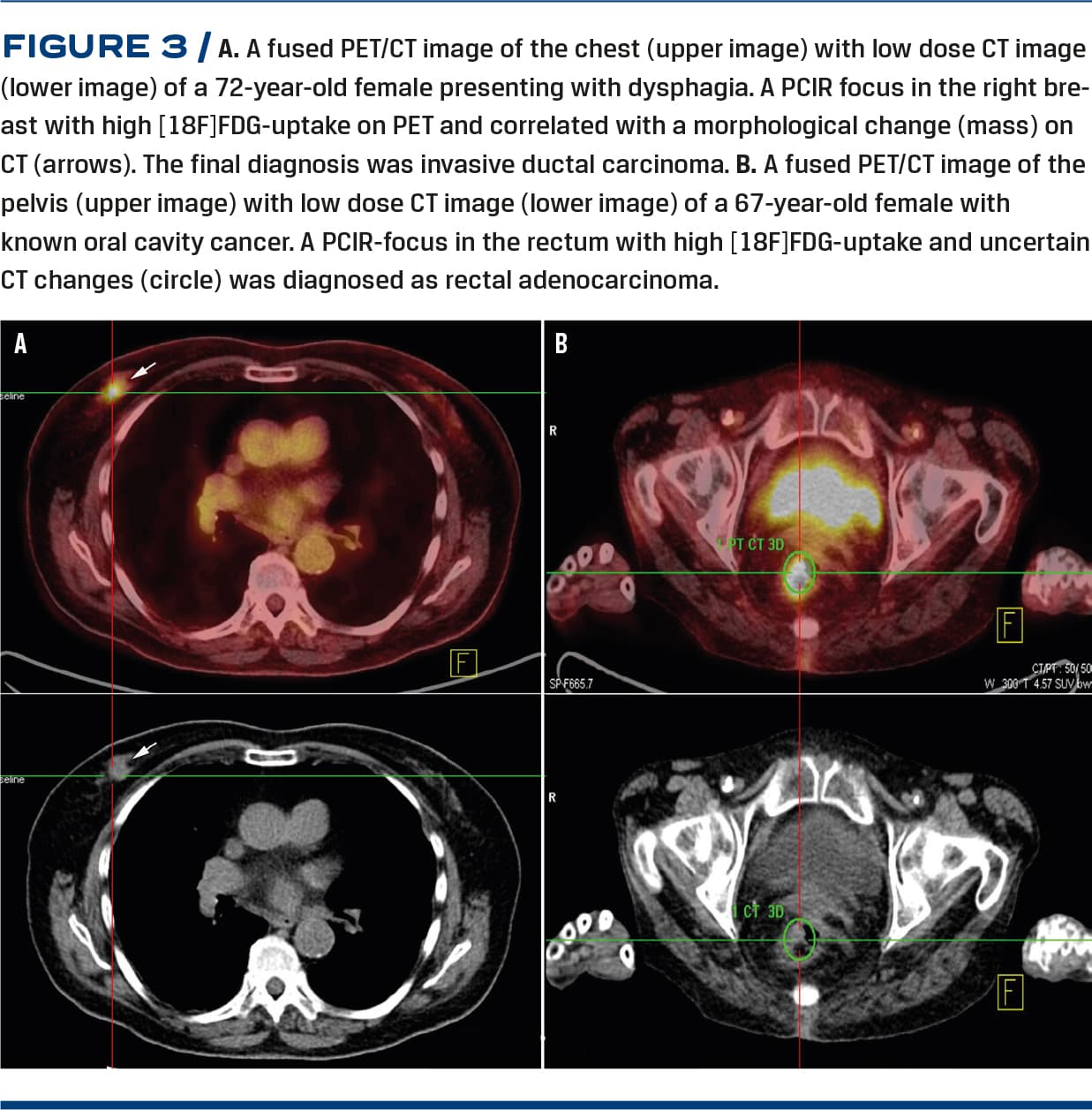 A PClR focus was considered a true positive (TP) if clinically relevant and unrelated to the patient’s disease whether malignant, premalignant or benign, and was considered a false positive (FP) if not associated with pathology. The positive predictive value (PPV) was calculated as follows: . The negative predictive value (NPV) could not be obtained as false-negative (FN) and true-negative values (TN) were unknown although foci with hypo- or iso-FDG metabolism were taken into account.
