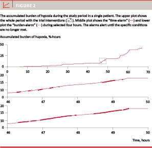 To intervene every time a highly fluctuating rStO2 goes below 55% may possibly lead to overtreatment. However, the “time-alarm” would be insufficient for the phase II trial only alerting during 49% of the total burden of hypoxia, whereas the “burden-alarm” would alert during 77% of the total hypoxic burden.