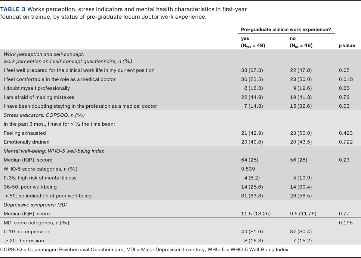RESULTS. Overall, 297 junior doctors (38% response rate) completed the survey. Whereas the majority (66-79%) reported positive perceptions of the introduction, supervision and preparedness, 25% doubted their ability to remain in the profession. Approximately one-third reported exhaustion or stress more than half the time. Moreover, 13% scored below 35 on the WHO-5 Well-Being Index, indicating a high risk of stress-related disorders. Overall, 18% had a Major Depression Inventory score ≥ 20, consistent with depression. Pre-graduate locum experience was significantly associated with greater perceived preparedness and confidence, but not reduced stress or depressive symptoms.