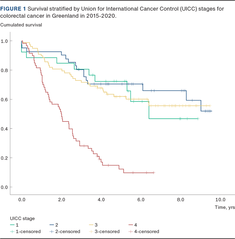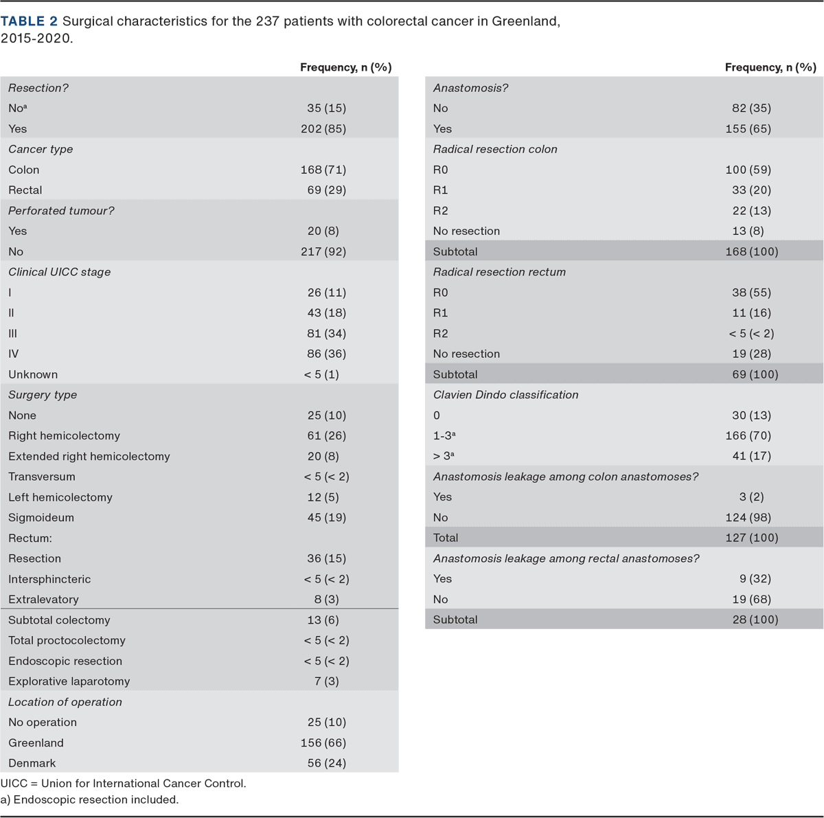 RESULTS. The study included 237 patients with colorectal cancer in Greenland. Rectal cancer constituted 29%. The distribution percentages by UICC-stage I, II, III and IV were 11%, 18%, 34% and 36, respectively. Radicality for all patients was as follows: R0 59% for colon cancer and 55% for rectal cancer. The anastomotic leakage rate was 2.4% for colon cancer and 32% for rectal cancer. Ninety-day mortality was 2.5% for colon cancer and 2.1% for rectal cancer. Five-year-survival was 43% for colon cancer and 47% for rectal cancer, with no significant difference regarding sex or place of residence. For electively resected patients, the five-year survival rate was 49% for colon cancer and 68% for rectal cancer.
