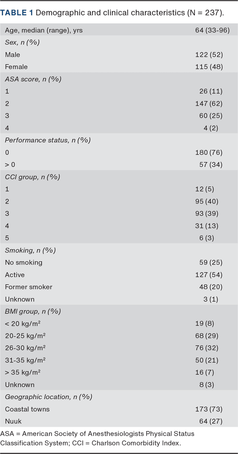 A total of 274 patients were identified with suspected carcinoma of the colon or rectum from 2015 to 2020. In all, 37 (13%) were excluded; 25 patients because they were diagnosed outside the observation period, seven with a benign histology, four patients because the histological diagnosis revealed another type of cancer, one patient due to missing information because the patient had left Greenland.