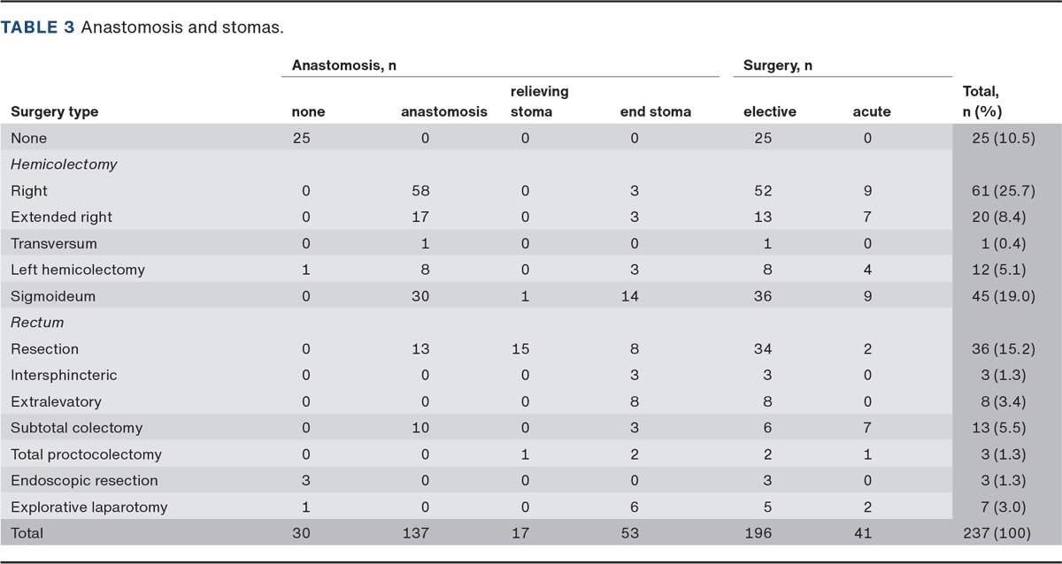The majority of patients had Union for International Cancer Control (UICC) stage III and IV at the time of diagnosis. The median lymph node harvest 18 for colon resections and 23 for rectal resections. The R0-rate was low for both colon (59%) and rectal resections (55%). Furthermore, the results show that anastomosis leakage for rectal anastomosis was 32%.