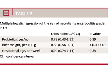 Multiple regression analyses (Table 2) did not change the OR for NEC grade 2 + 3 significantly compared with the simple relation to probiotics.