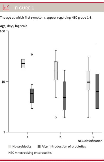 periods. Multiple logistic regression using period (probiotics yes/no), gestational age in completed weeks, and birth weight as predictors were used to explore the possibility that a change in case load could have influenced the comparison for NEC 2 + 3 (primary outcome). The postnatal age of first symptoms of suspected or confirmed NEC was transformed logarithmically to achieve a normal distribution, and this age was compared between the groups using a t-test and multiple linear regression with birth weight, gestational age and NEC grade as supplementary independent variables.