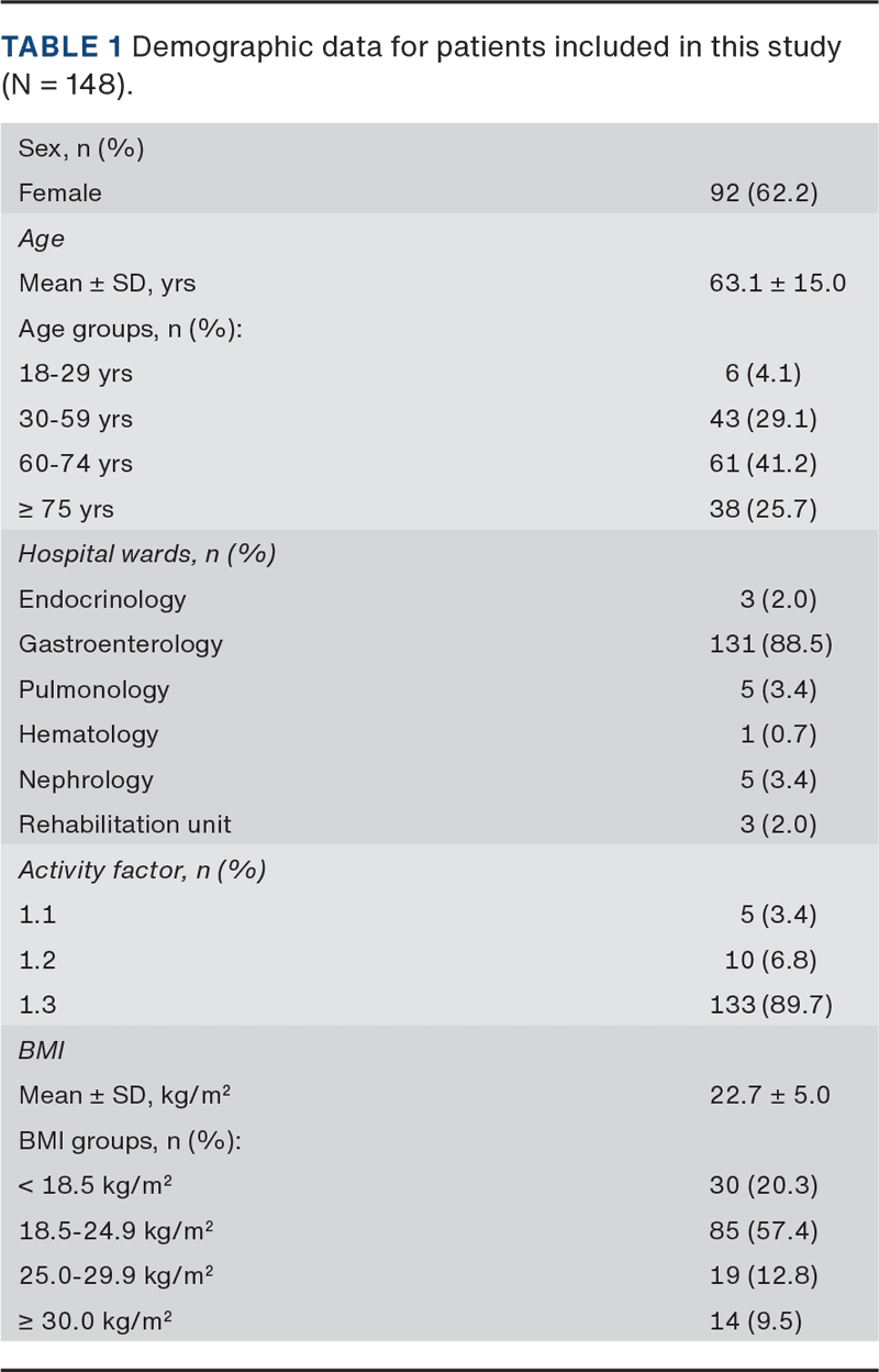 Among the included patients, 62.2% were female with a mean age of 63.1 ± 15.0 years and a mean BMI of 22.7 ± 5.0 kg/m2. Most patients were admitted to the gastroenterology ward (88.5%), and most had an estimated AF of 1.3 (89.7%). The mean admission day on which the patients had their IC measurement was 8.1 days (see Table 1).