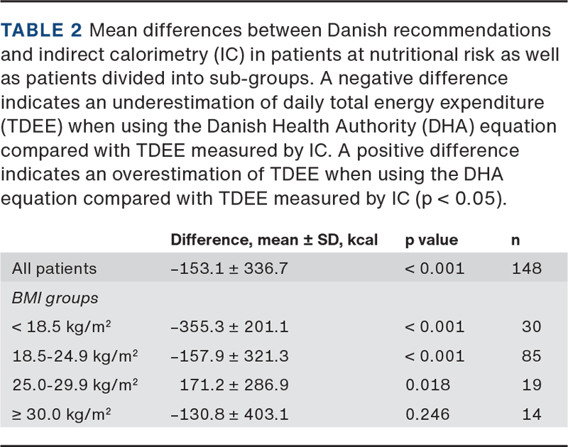 Using the DHA estimates for TDEE compared with the values measured by IC, 72 patients (48.6%) were underestimated, and 25 (16.9%) were overestimated by more than 10%. Thus, only 51 (34.5%) of patients were estimated within ± 10% TDEE as measured by IC. The mean difference between estimates and measured TDEE was significant, with the DHA equation underestimating TDEE compared with TDEE measured with IC (p < 0.001). When grouping patients by BMI, all estimates differed significantly from the measured IC, except for patients with a BMI ≥ 30 kg/m2 (p = 0.246). The groups with a BMI < 18.5 kg/m2 and between 18.5 and 25.0 kg/m2 were significantly underestimated when comparing the DHA equation with the TDEE measured by IC (p < 0.001), whereas patients with a BMI of 25.0-29.9 kg/m2 were significantly overestimated when comparing the DHA equation with the TDEE measured by IC (p = 0.018) (see Table 2).