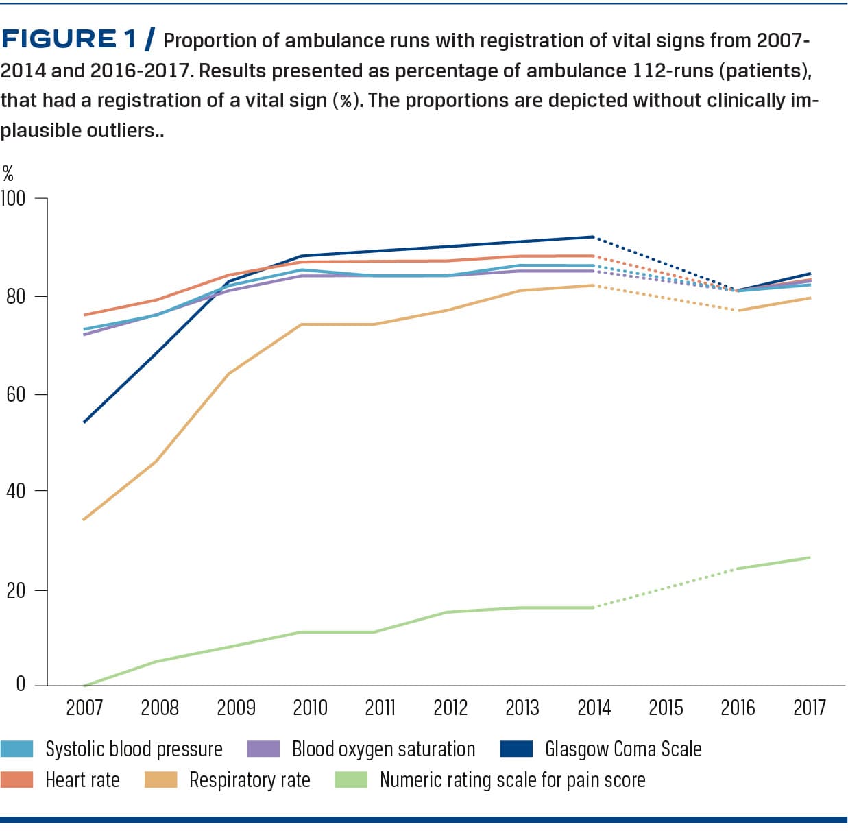 Results: We included 253,169 PPRs. The proportion of PPR with registration of vital signs from 2007-2014 compared with 2016-2017 was BP: 73-86%, 81-82%; HR: 76-88%, 82-83%; SpO2: 72-85%, 82-83%; RR: 34-82%, 77-79%; GCS score: 54-92%, 81-84%; NRS for pain: 0-16%, 24-26%. The increase from 2007-2014 and 2016-2017 was significant as were the differences between 2014 and 2016. We found few defined outliers (0.5%).