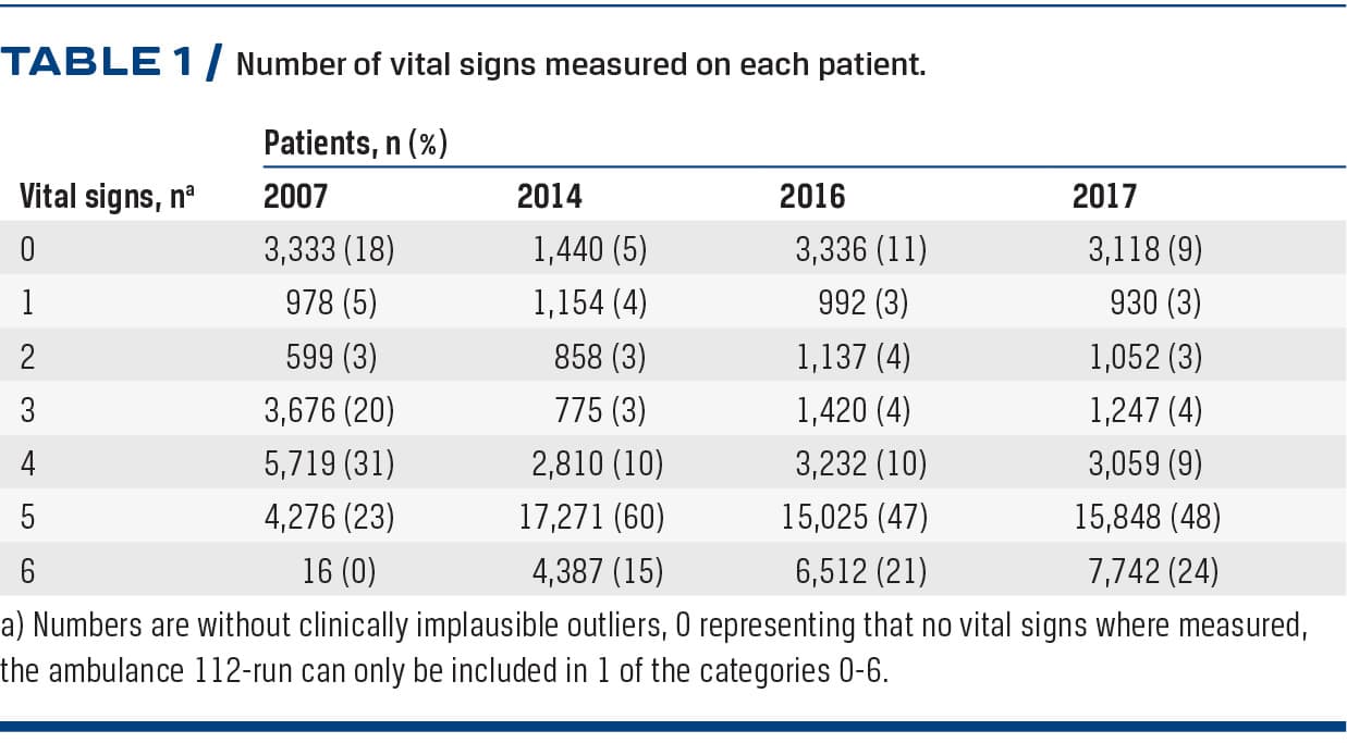 We only included the patients’ first registered vital sign measurements in the analysis as our aim was to investigate vital signs data completeness. Furthermore, this represents the patient’s condition as met by the ambulance personnel shortly after the ambulance arrived.