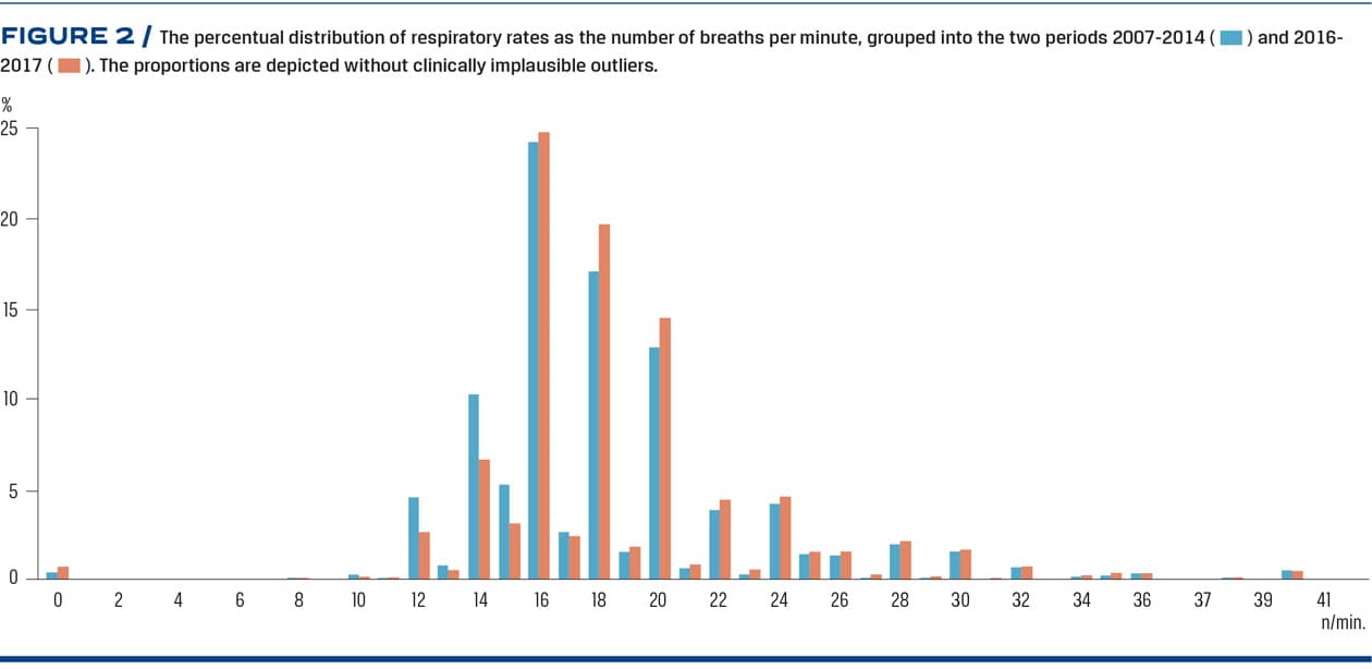 RR was predominantly measured as number of breaths per minute, dividable by two throughout the study period (Figure 2).
