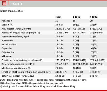 There was no overall difference in mortality between the group of children above and below 10 kg.There was no difference in the number of days of CRRT treatment between survivors and non-survivors (six days).