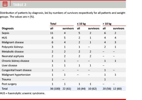 Since the introduction in April 1998, we have registered the use of CRRT in paediatric patients. This study consisted of a journal review of the registered children below 16 years treated with CRRT in the PICU until 1 April 2011. The following clinical data were recorded: gender, age, premorbid weight, diagnosis, indication for CRRT, the number of vasoactive drugs to support circulation, number of days with CRRT, number of days in the PICU and outcome (discharge from the PICU ± RR).