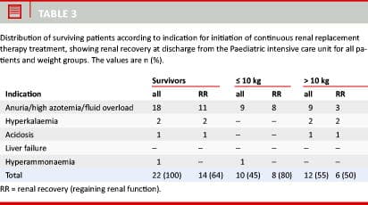 The PICU at Odense University Hospital (BRITA), Denmark, has been using CRRT in children since 1998. The purpose of this paper was to present the use of CRRT in children and to evaluate the efficacy of such treatment. We compared children with CRRT-treated adults with AKI with respect to return of kidney function (renal recovery (RR)) and mortality. Furthermore, we compared RR and mortality in children above and below 10 kg.