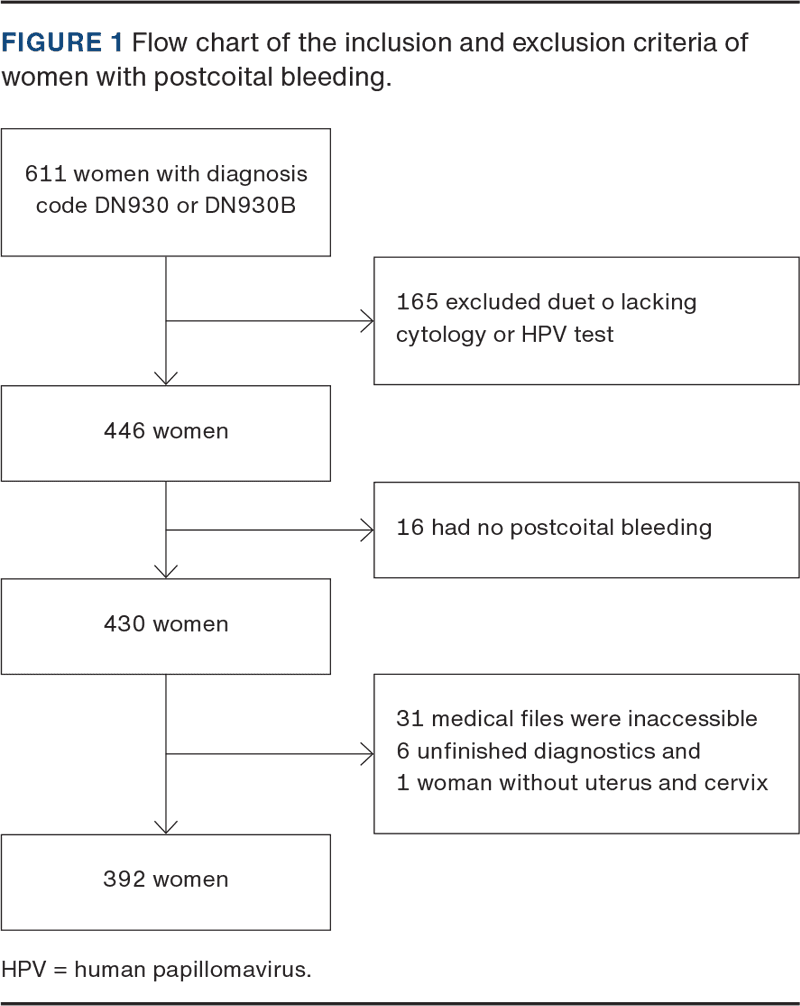 In this study, 611 women were identified with the ICD-10 diagnosis codes "DN930 postcoital and contact bleeding" and "DN930B for Contact bleeding". The study population of 392 women was included in the final analysis, as illustrated in Figure 1.