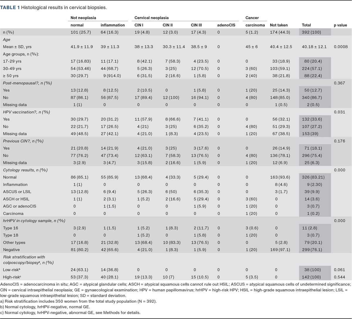 To estimate the reduction in colposcopy referrals, patients were categorised into low- and high-risk groups using the following criteria: Low-risk was defined as women with normal cytology, negative hrHPV and normal GE findings (the cervix was described as normal, plump or with an erythroplakia). High-risk women had either abnormal cytology, positive hrHPV or abnormal GE findings, including visible tumours, polyps or vulnerable mucosa, defined clinically as areas that bleed upon contact or gentle brushing during speculum examination.