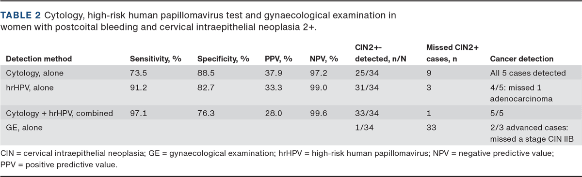 Human papillomavirus (HPV) is a common sexually transmitted virus associated with cervical cancer [1]. In Denmark, women aged 23 to 65 years are offered free cervical cancer screening every 3-5 years, with the latest data showing a national screening coverage of 74% [2, 3]. Additionally, HPV vaccination has been provided free of charge to young people up to the age of 18 years. It has also been included in the national vaccination programme, with recent data indicating an 87% coverage rate [4, 5]. Despite these measures, symptoms like postcoital bleeding (PCB), defined as bleeding during or right after intercourse, remain a diagnostic challenge, as they can indicate benign conditions, such as cervicitis or polyps, or more severe conditions like cervical cancer [6]. Traditionally, guidelines recommend that women with PCB should be referred for colposcopy to exclude malignancy [7, 8]. However, studies show that only a small percentage of PCB cases involve cervical intraepithelial neoplasia (CIN) requiring treatment, defined as CIN2+ (CIN II, CIN III, adenocarcinoma in situ and cervical cancer), raising concerns about the overuse of colposcopy [9]. In July 2022, hospitals in the Region of Southern Denmark introduced a new diagnostic strategy to reduce unnecessary colposcopies in such cases. Following the new strategy, women with PCB initially undergo cytology and high-risk human papillomaviruses (hrHPV) testing, with referral to colposcopy only if results show either abnormal cytology, positive hrHPV or an abnormal gynaecological examination (GE). This new approach is referred to as the three-test strategy. Research shows that hrHPV testing has a higher sensitivity and negative predictive value than cytology for detecting CIN II and III, supporting its use in targeted diagnostics [10]. Postmenopausal women with negative results from all three tests (cytology, hrHPV and GE) are referred for endometrial diagnostics to exclude other causes. As an additional safety measure, patients are instructed to return if PCB symptoms persist for more than three months, ensuring that no cases are missed.