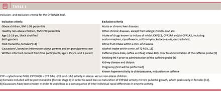 The power calculations in this study are based on results from previous studies in adults (CYP3A4 and CYP2E1) [11] and obese children (CYP1A2) [9]. Inclusion of 50 obese and 50 non-obese children is the result of a minimum relevant difference chosen to be 30% based on an expected inter-individual variability and an expected clinically important alteration in the metabolism, especially for drugs with a narrow therapeutic interval. In a future perspective, it could be of interest to investigate other enzymes such as CYP2D6; however, due to gene polymorphism [8], an even larger sample size would be required.