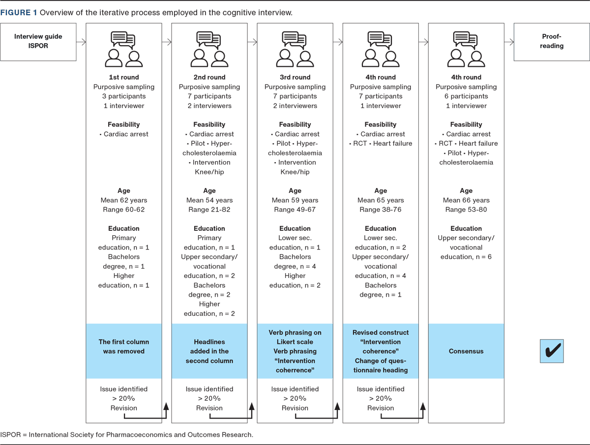 RESULTS. Following translation, 30 participants (37% female, mean age 61 years) completed cognitive interviews. The population included cardiac arrest survivors and their relatives, patients with hypercholesterolaemia, knee/hip osteoarthritis and patients at risk of heart failure. Five iterative rounds informed adaptations of the Danish version, resolving misinterpretations and improving clarity. Four main issues were identified: 1) structure of the questionnaire, 2) translation of the terms “acceptability” and “intervention”, 3) wording of the Likert scale and 4) item-specific interpretation problems.