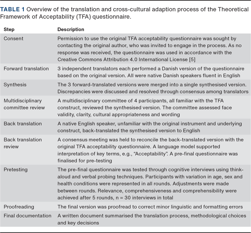 The TFA has been widely adopted in healthcare research [5, 6], but a cross-cultural adaptation to the Danish context is required to ensure reliable and valid evaluations of acceptability. Instruments developed in other cultural settings may lose meaning or introduce bias through literal translation if cultural and linguistic nuances are overlooked [7-9]. Therefore, a rigorous translation and adaptation process ensuring linguistic, semantic and conceptual equivalence is essential to maintain content validity [10]. Accordingly, the objective of this study was to translate and cross-culturally adapt the TFA questionnaire into Danish, ensuring semantic and conceptual equivalence to preserve content validity.