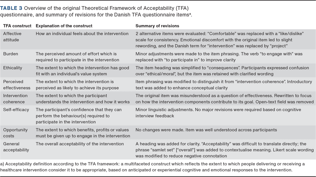 INTRODUCTION. Acceptability of healthcare interventions among patients and healthcare professionals is important for effective and efficient implementation in clinical settings. To standardise the assessment of acceptability of healthcare interventions, the Theoretical Framework of Acceptability (TFA) questionnaire was developed. In this study, we aimed to translate and cross-culturally adapt the TFA questionnaire into Danish.