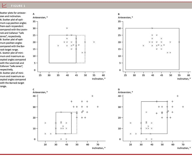 A total of 68% of the surgeons’ assessment of minimum and maximum accepted inclinations were within the Lewinnek “safe zone”, whereas 79% were within the Barrack target range. A total of 67% of the respondents indicated minimum and maximum accepted anteversion angles within the Lewinnek “safe zone”, whereas 95% were within the Barrack target range.