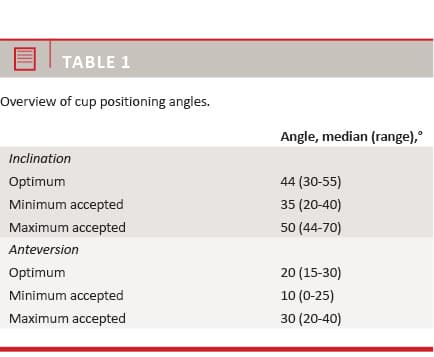Table 1 presents an overview of optimum, minimum and maximum accepted angles in inclination and anteversion for acetabular component positioning based on answers from the gathered questionnaires.