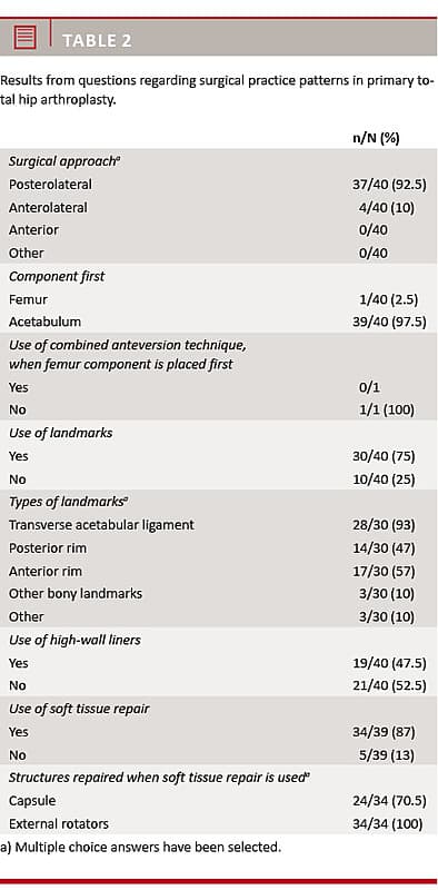 Concerning surgical technique, one surgeon placed the femural component before inserting the acetabular component and did not use combined anteversion technique. The current practice pattern shows that 75% of the surgeons stated the use of anatomical landmarks when inserting the acetabular component, whereas 87% of the surgeons reported the use of posterior soft tissue repairs in the