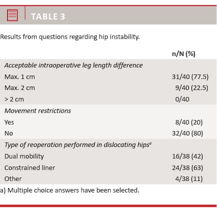 Reoperation for dislocation was offered when a mean of 2.9 dislocations had occurred within one year, and when satisfactory component positioning on radiographs, restoration of leg length and off-set had been achieved. Questions regarding perioperative decisions with regard to hip instability are summarized in Table 3.
