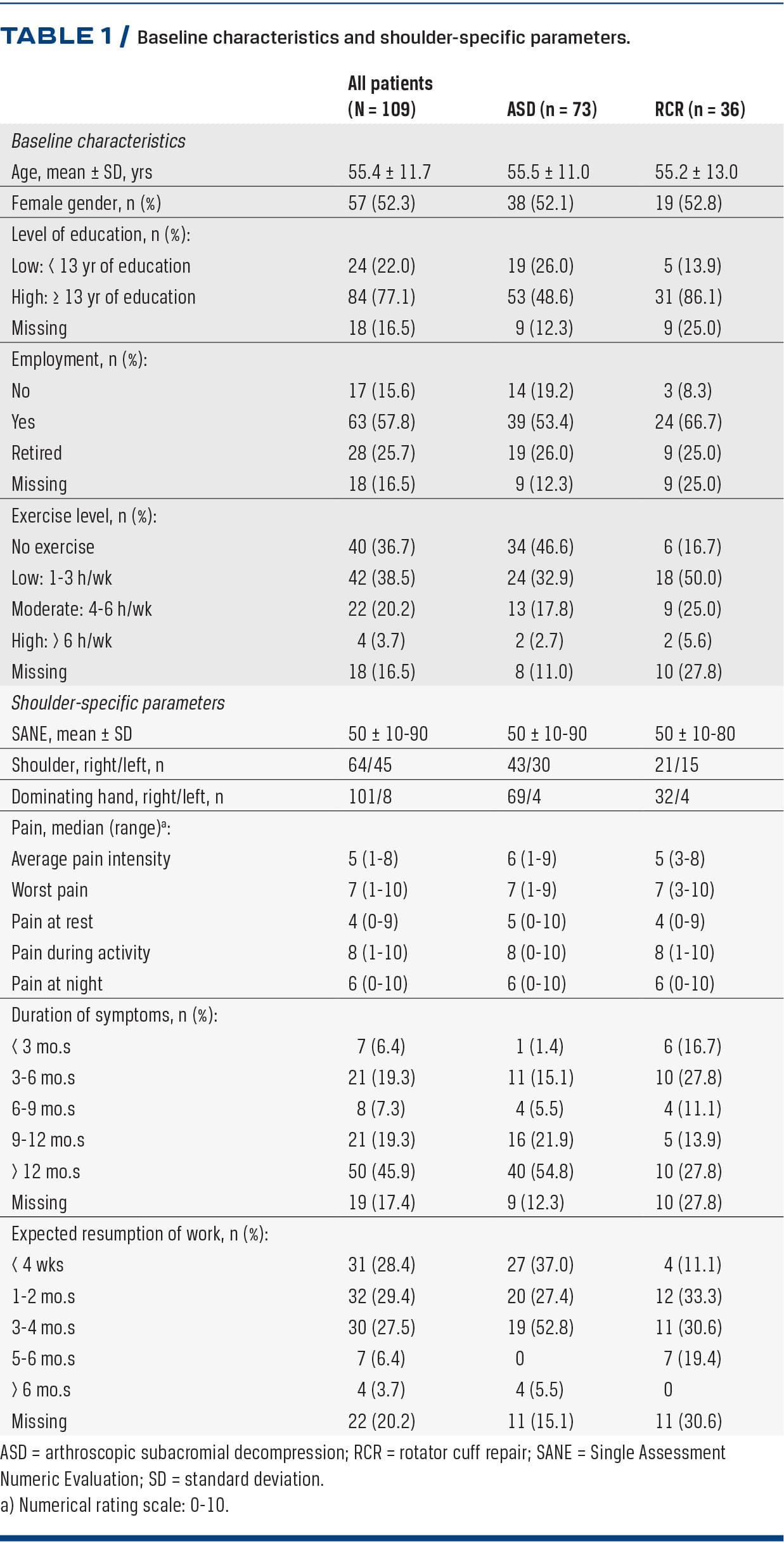 Patients were analysed both as a total group and in two sub-groups: group ASD (subacromial disease such as impingement, biceps tendinitis) and group RCR (rotator cuff tears). According to quality criteria for measurement properties of health status questionnaires, a sample size of at least 50 in each subgroup was required [15]. In case of one missing value in a domain, the domain score was calculated using the average of the other items in the domain. If more than two items were missing in a domain, the WORC questionnaire was excluded from analyses [1].