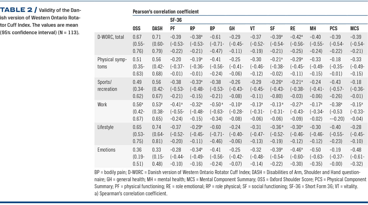 The aim of this study was therefore to translate and adapt the WORC into a Danish version (D-WORC) and to evaluate the validity, reliability and responsiveness of the D-WORC in a cohort of native Danish-speaking patients undergoing surgery for arthroscopic subacromial decompression (ASD) or rotator cuff repair (RCR). We hypothesised that the D-WORC was positively correlated with other shoulder-specific questionnaires (OSS and DASH), but negatively correlated with a generic questionnaire (Medical Outcomes Study Short-Form 36 (SF-36)).