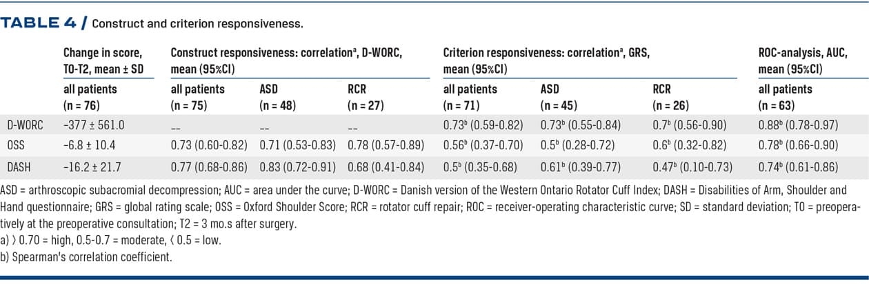 Table 4 offers an overview of the construct and criterion responsiveness with low to high correlations. The D-WORC (AUC = 0.88; 95% CI: 0.78-0.97) had a higher AUC than the OSS (AUC = 0.78; 95% CI: 0.66-0.90) and the DASH (AUC = 0.74; 95% CI: 0.61-0.86).