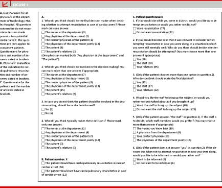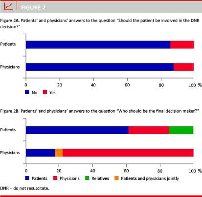 The aim of this study was to answer two questions: 1) Do physicians and patients desire to discuss the DNR order, and who do they think should make the final decision? 2) Do patients and their physicians agree on whether resuscitation should be attempted in case of cardiac arrest?