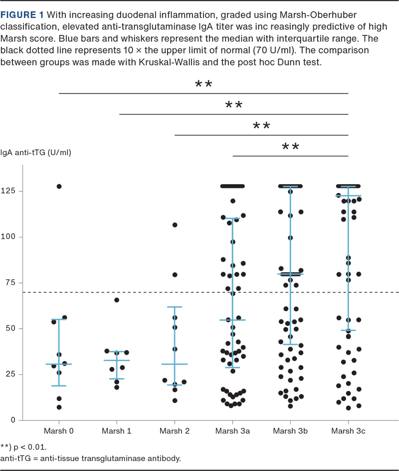 - Zanini B, Magni A, Caselani F, et al. High tissue-transglutaminase antibody level predicts small intestinal villous atrophy in adult patients at high risk of celiac disease. Dig Liver Dis. 2012;44(4):280-285. https://doi.org/10.1016/j.dld.2011.10.013