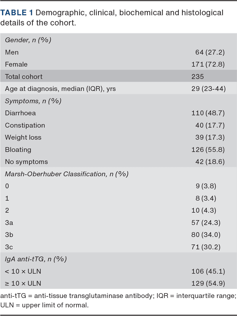 A total of 302 patients were identified. Among these, 67 patients were excluded from analysis due to lacking consent for gastroscopy (n = 36); IgA deficiency (n = 9); start of GFD before the time of referral (n = 7); duodenal biopsies disqualified by the pathologist (n = 6); diagnosis of seronegative CD (n = 6); or because they received immunotherapy (n = 3). Overall, 235 patients had complete data on duodenal histology and IgA anti-tTG level and were included in the analysis. Data regarding gender distribution, age at diagnosis, symptoms and March classification are presented in Table 1.