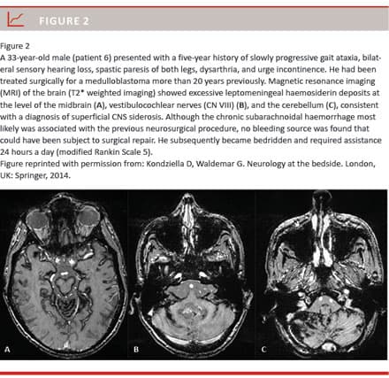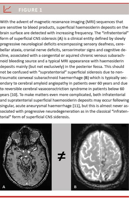 In the “classic” or “infratentorial” type of superficial CNS siderosis, subpial haemosiderin deposits of the brain and spinal cord accumulate due to chronic subarachnoid haemorrhage, often causing progressive ataxia, deafness, dementia and sometimes a bed-ridden helpless state (Figure 1 and Figure 2) [1-9]. Many different conditions can lead to this form of superficial CNS siderosis, including congenital malformations such as fluid-filled collections in the spinal canal, CNS tumours, post-neurosurgery, head or back trauma, arteriovenous malformations and brachial plexus/root injuries [4, 5]. Surgical removal of the bleeding source remains the only causative treatment option. However, knowledge about treatment outcomes is scarce and typically derived from single case reports [1, 3, 5-9]. We therefore present a consecutive case series from a tertiary neuroscience centre in order to stress the challenges related to diagnosing and treating patients with superficial CNS siderosis.