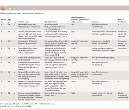 Results: A potential bleeding aetiology was identified in all patients, but removal of the offending bleeding source was achieved only in three (33%). Symptom progression was halted in just one patient (11%), which suggests that neurodegeneration due to haemosiderin-associated iron toxicity becomes irreversible with time.