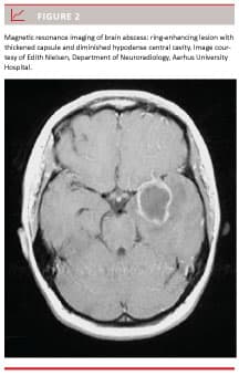 Acute otitis media (AOM) (Figure 1) is one of the most frequent paediatric diseases, but the condition may also occur among adults. Cholesteatoma is a much less common middle ear disease with onset in childhood or adulthood. Usually, the course of both AOM and cholesteatoma is benign, at least in developed countries with high socio-economic standards and easy access to health services [1]. However, due to the close anatomical proximity of the middle ear cleft and the brain, the infection can spread to intracranial structures, and otogenic meningitis or even brain abscess (BA) (Figure 2) may develop [1, 2].